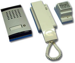 1 Button kit including a surface mount door panel [Dimensions: 100mm(W), 167mm(H), 40mm(D)] with call button and name plate available in either aluminium(/A), gold(/G) or white(/W) finish, a 12Vac 15VA DIN box transformer and a wall mountable handset with electronic call tone and door release facility.